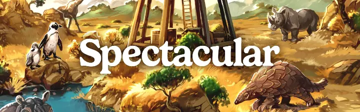 Spectacular destaca también por su presentación visual. Las ilustraciones de Ian O’Toole dan vida a cada hábitat con una elegancia sobria, y los componentes (dados de colores, losetas con animales, tableros personales asimétricos por su reverso) logran que el conjunto sea tan agradable de mirar como de jugar.